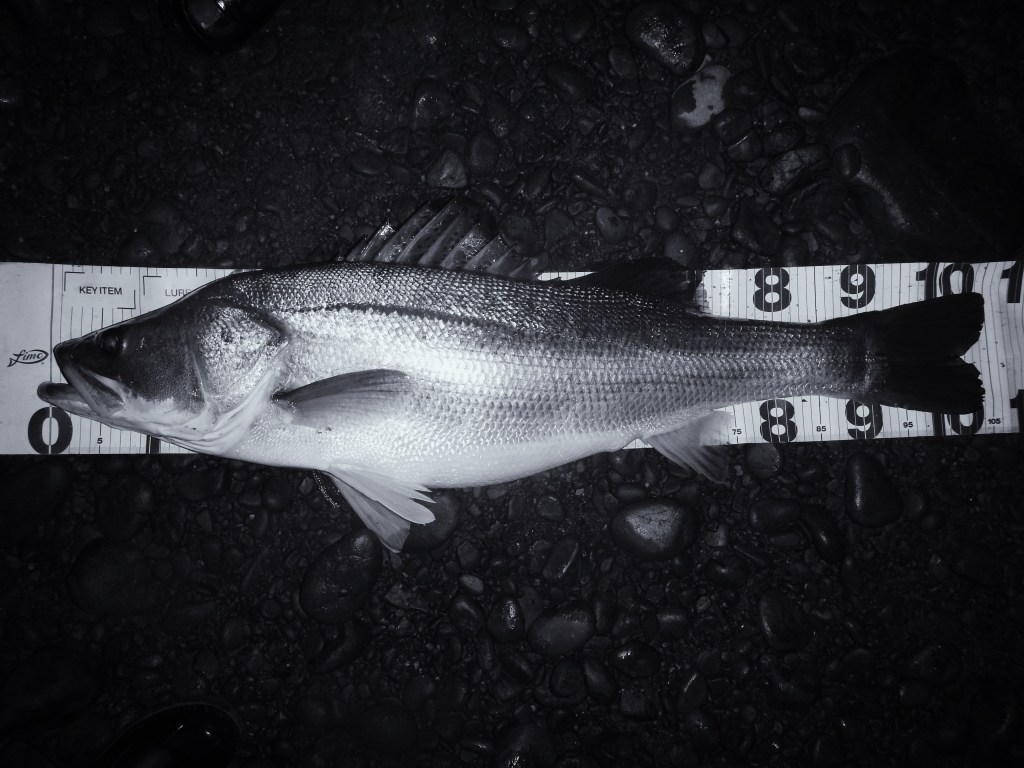 尋常じゃないエラ洗いの音。川に並んで、下流側に自分、上流側に遅れて来た後輩。その2人を挟んだ間でドラグが悲鳴を上げ続けている。”間違いなくデカい”確信すると共にすぐさまランディング補助の体制についた。この時の3人はさっきまでとは打って変わって、息が合っていた。何度も何度も練習してきたかの様に、自分が何をすれば良いか体が先に動いていく感覚。もう目前まで来た魚体をみた瞬間、思わず背筋が伸びた。想像を遥かに超える大鱸がそこにはいた。もう2度と味わえない初めての感覚。足がすくみ、変な声が出た。陸に上がったその魚体は、言葉や文字では言い表せない不思議な気持ちを胸に突き刺してきた。3人から出た言葉は”凄い”。色んな気持ちが飛び交う中、純粋に嬉しかった。3人だ。今度は1人じゃない。証明された瞬間だったのだ。釣り上げたのは決して自分では無い。でもその大鱸はこの川に、そのジアイに居合わせたのだ。何度も何度も魚を見た。本人は涙していた。それはそうだ。こんな大鱸釣り上げたのだから。震える手で針を外し、束の間の感動と共に優しく見送った。見えなくなるまで見届けた僕ら3人は、まるで子供みたいに笑った。あの日の夜の事は、今も忘れる事が出来ない。
