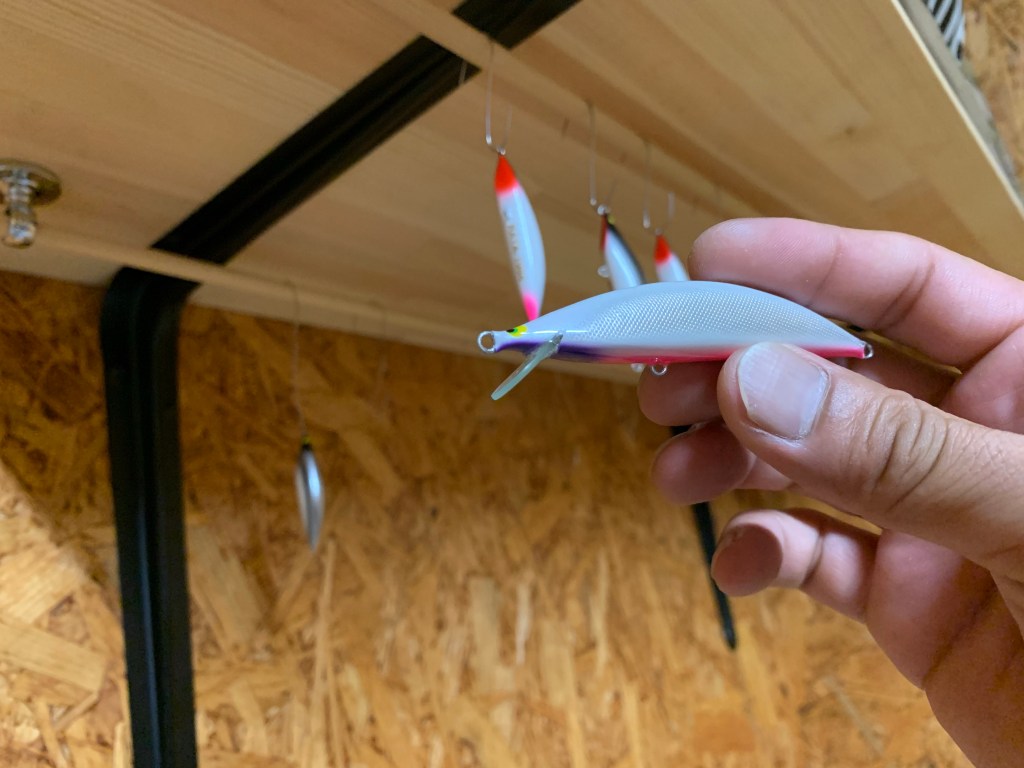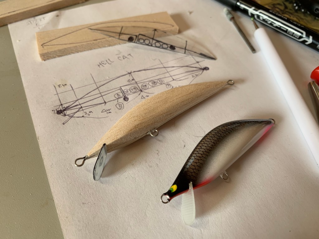 かねてより作っていた木片。ヘルキャット。8cm程度のシンキングミノーである。前にも書いたが、大型を狙う際に自分の釣りに必要なパーツであるレンジ攻略用の木片である。